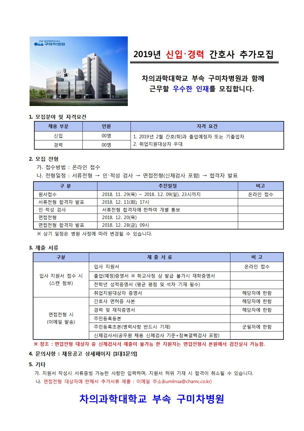 2019년도 간호학과 졸업예정자 및 경력 간호사 추가모집