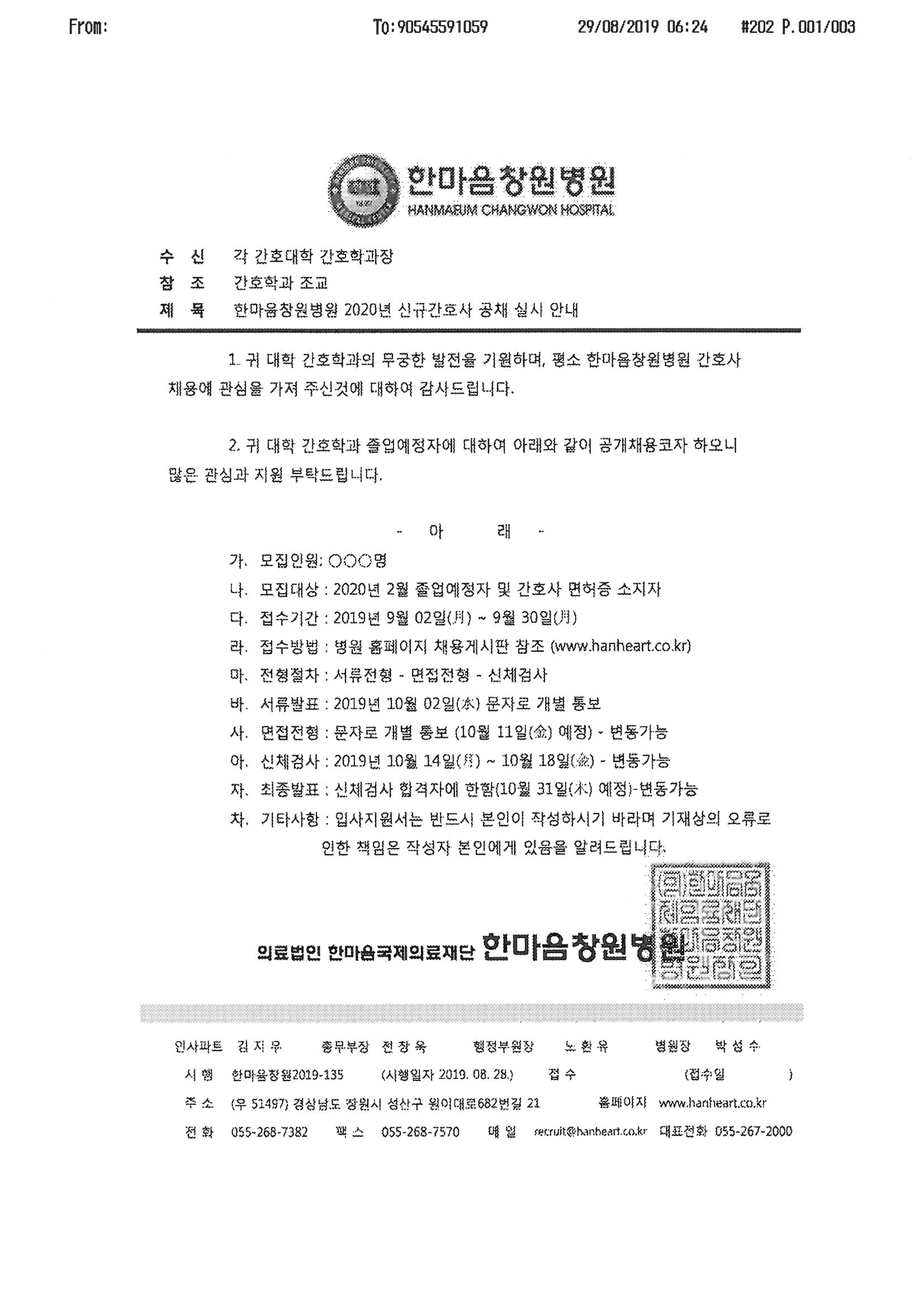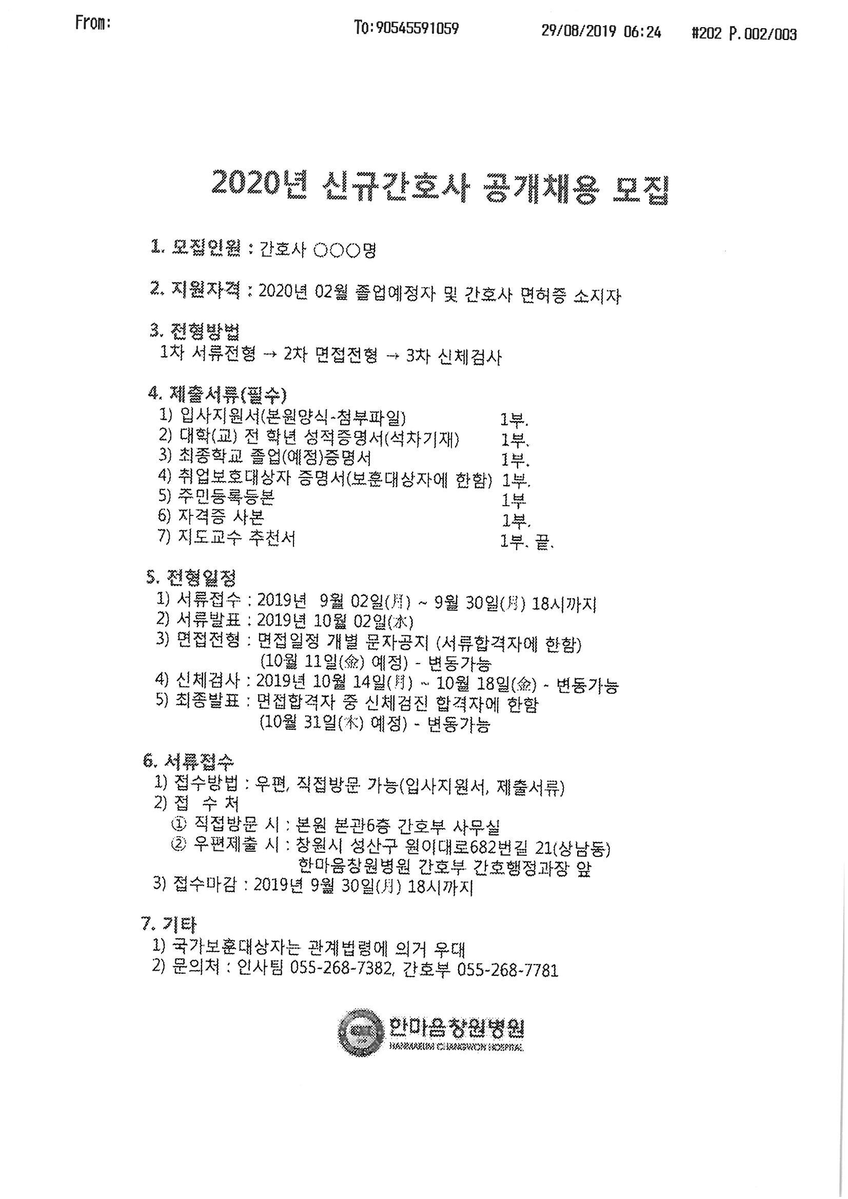 2020년 한마음창원병원 신규간호사 공채 실시 안내