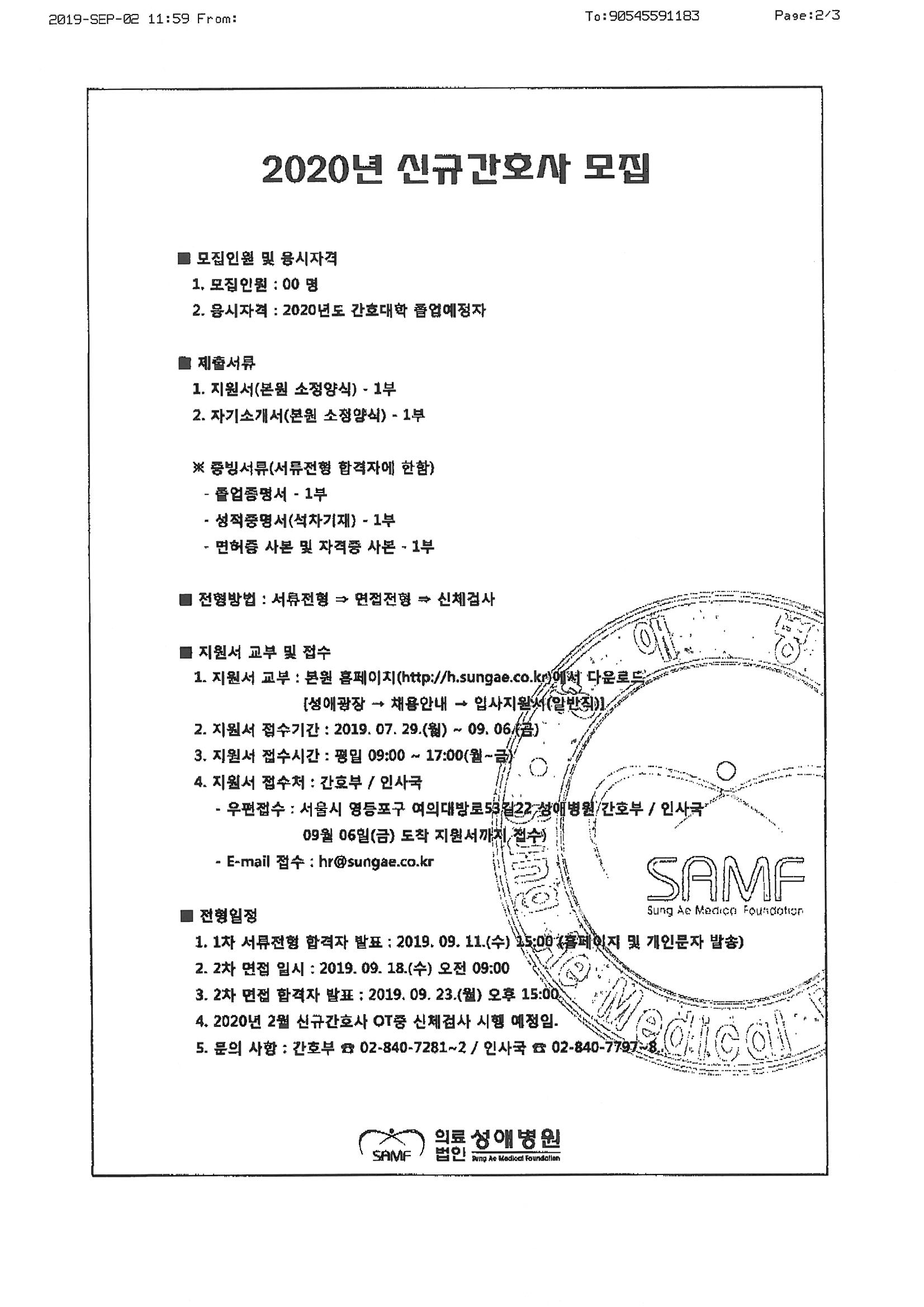 2020년 성애병원 신규간호사 모집