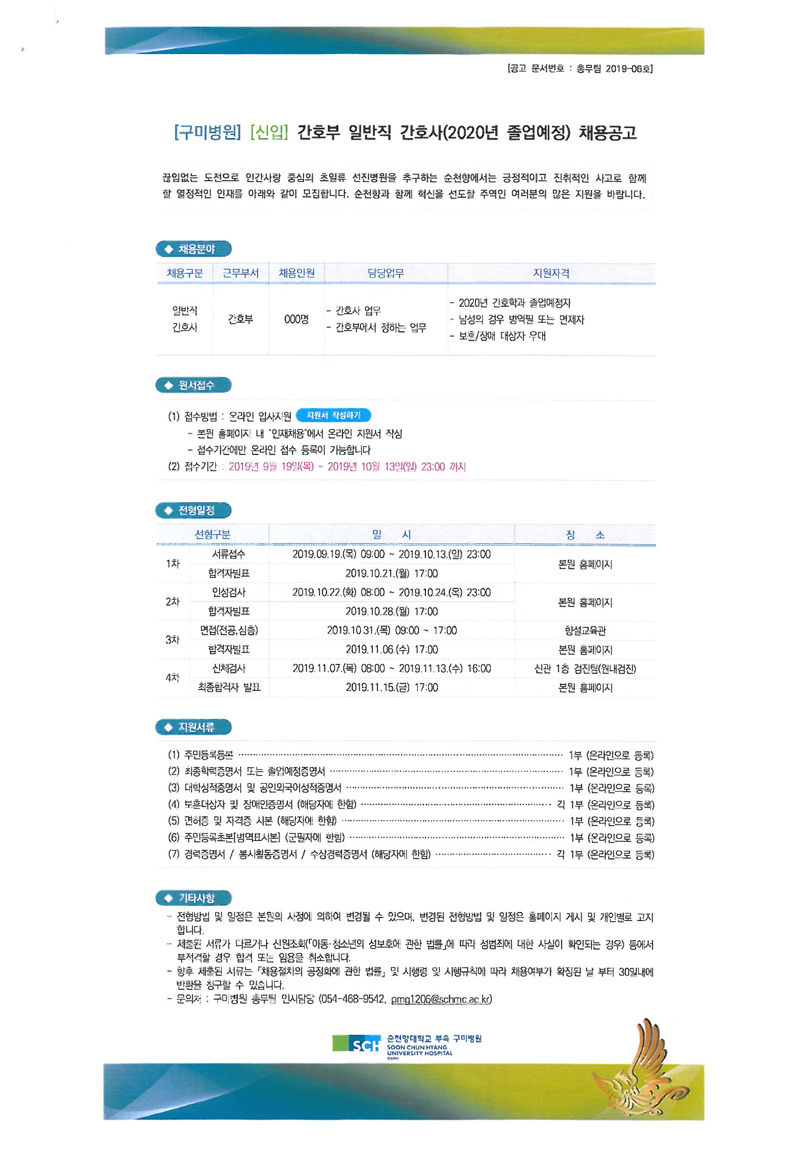순천향대학교 부속 구미병원 신규간호사 채용 실시