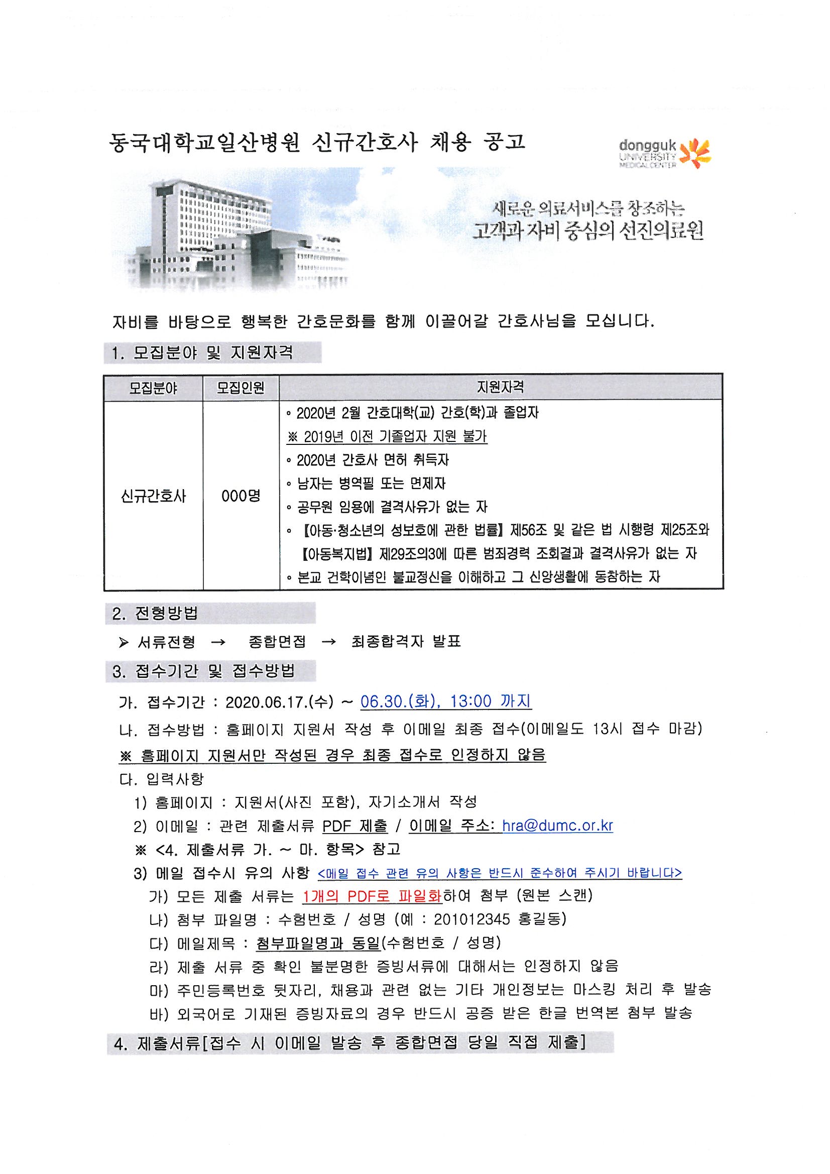 2020년도 동국대학교일산병원 신규간호사 채용 공고(졸업자대상)