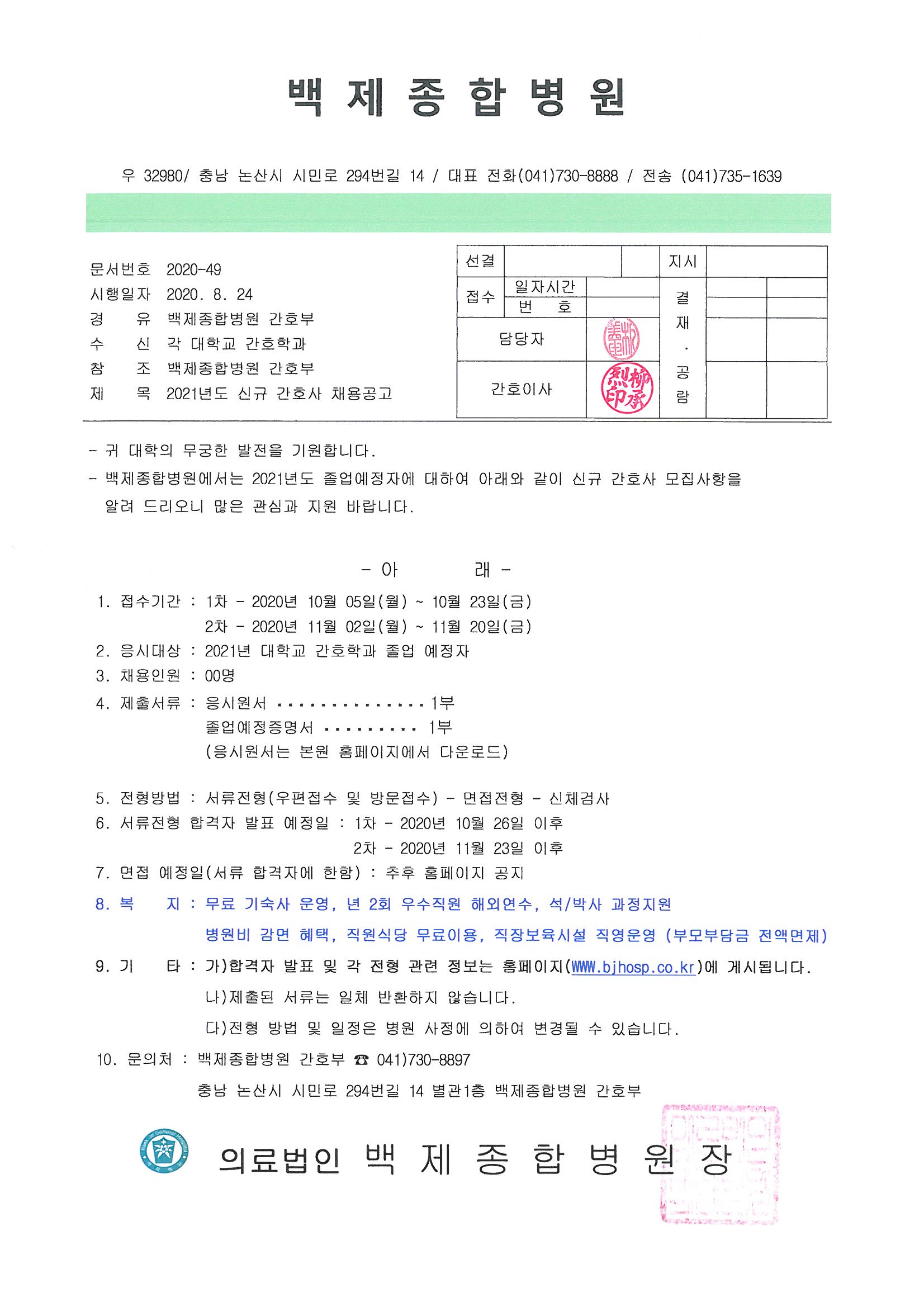 백제종합병원 2021년도 신규 간호사 채용공고