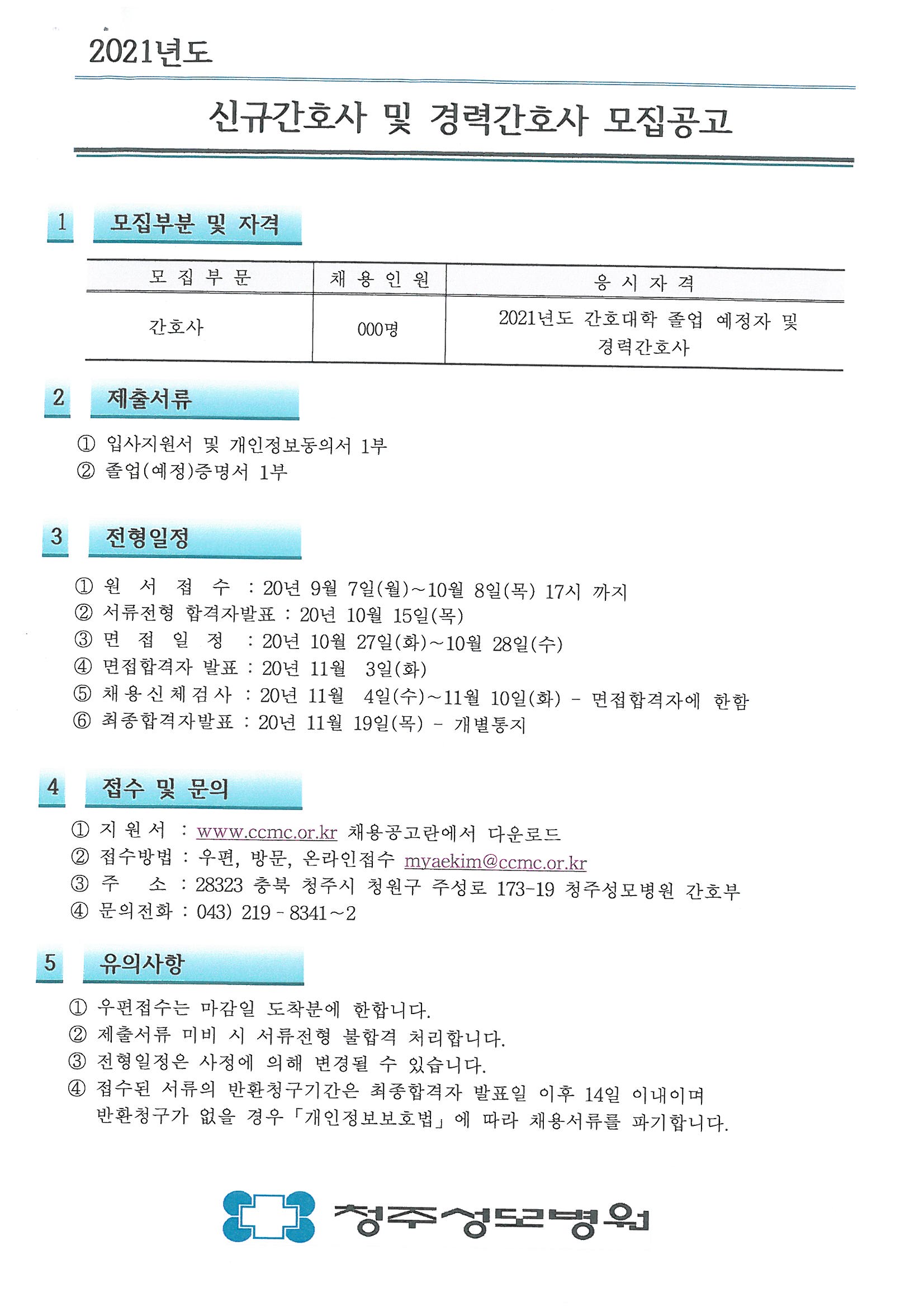 청주성모병원 2021년 신규 및 경력간호사 채용