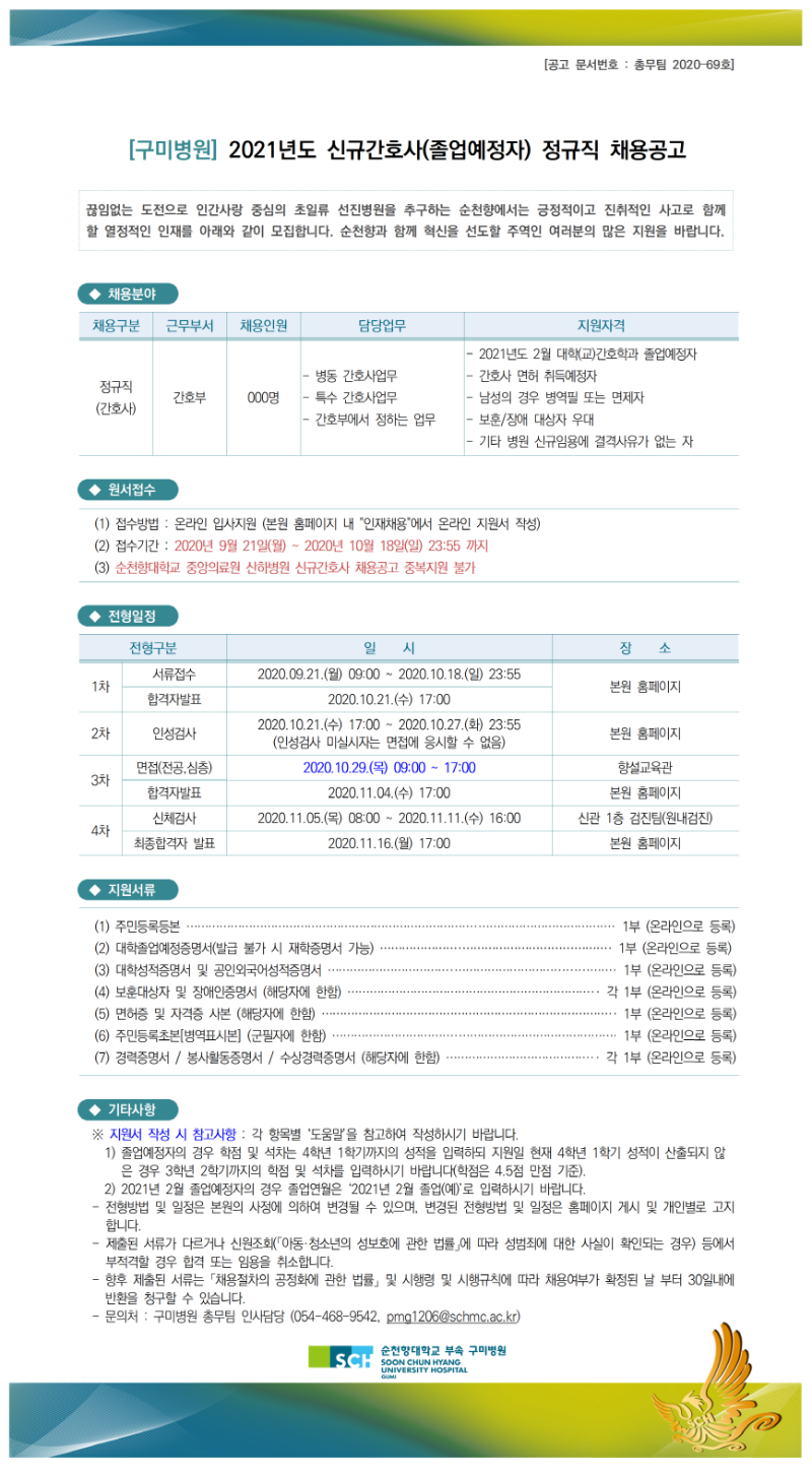 순천향대학교 부속 구미병원 2021년 신규간호사 채용
