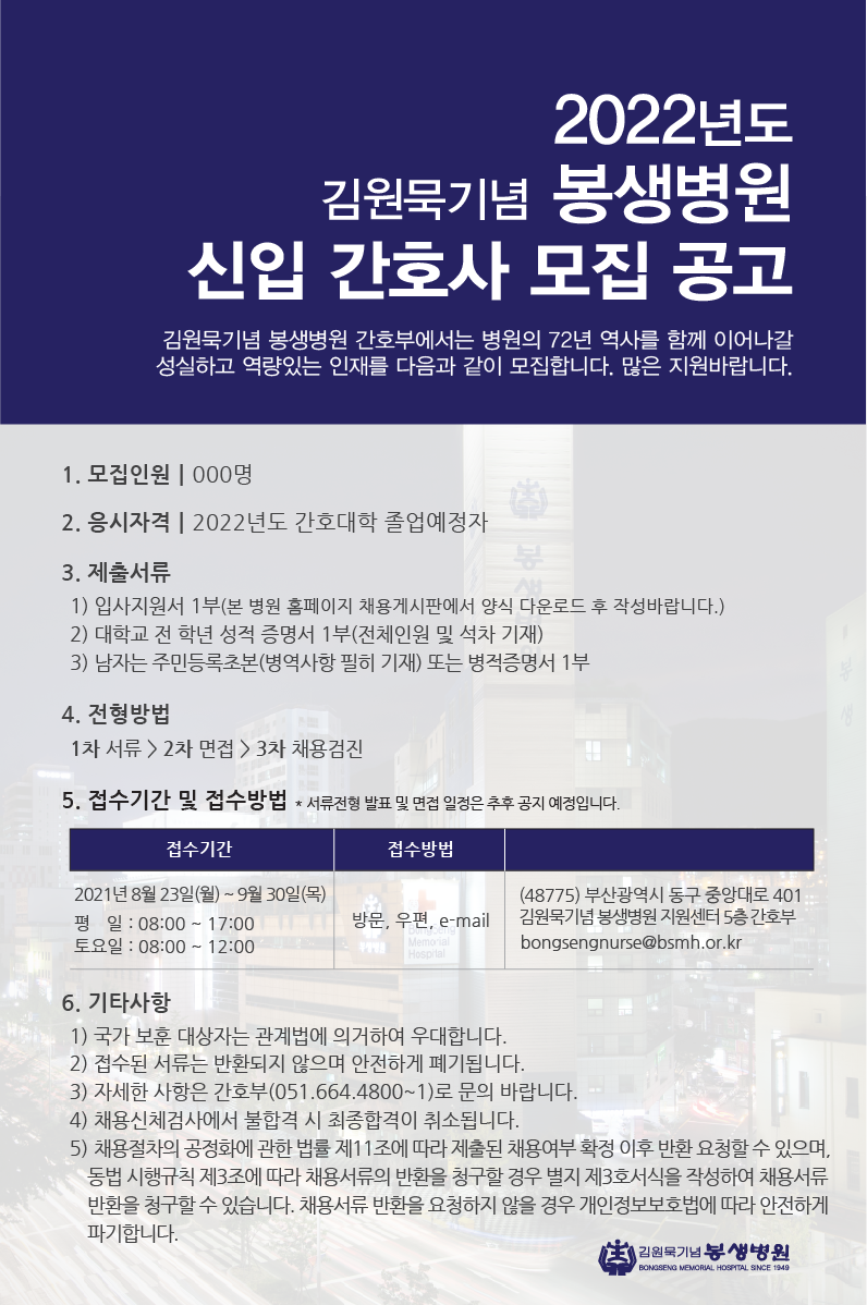 2022년도 김원묵기념 봉생병원 신규 간호사 모집