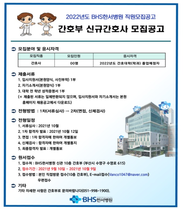 2022년 BHS한서병원 신규 간호사 채용 공고