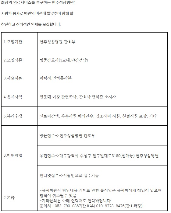천주성삼병원 2022년도 신규간호사 모집
