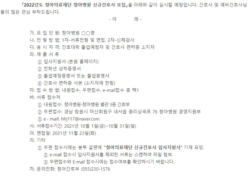 청아의료재단 동서병원, 청아병원 2022년 신규 간호사 채용공고