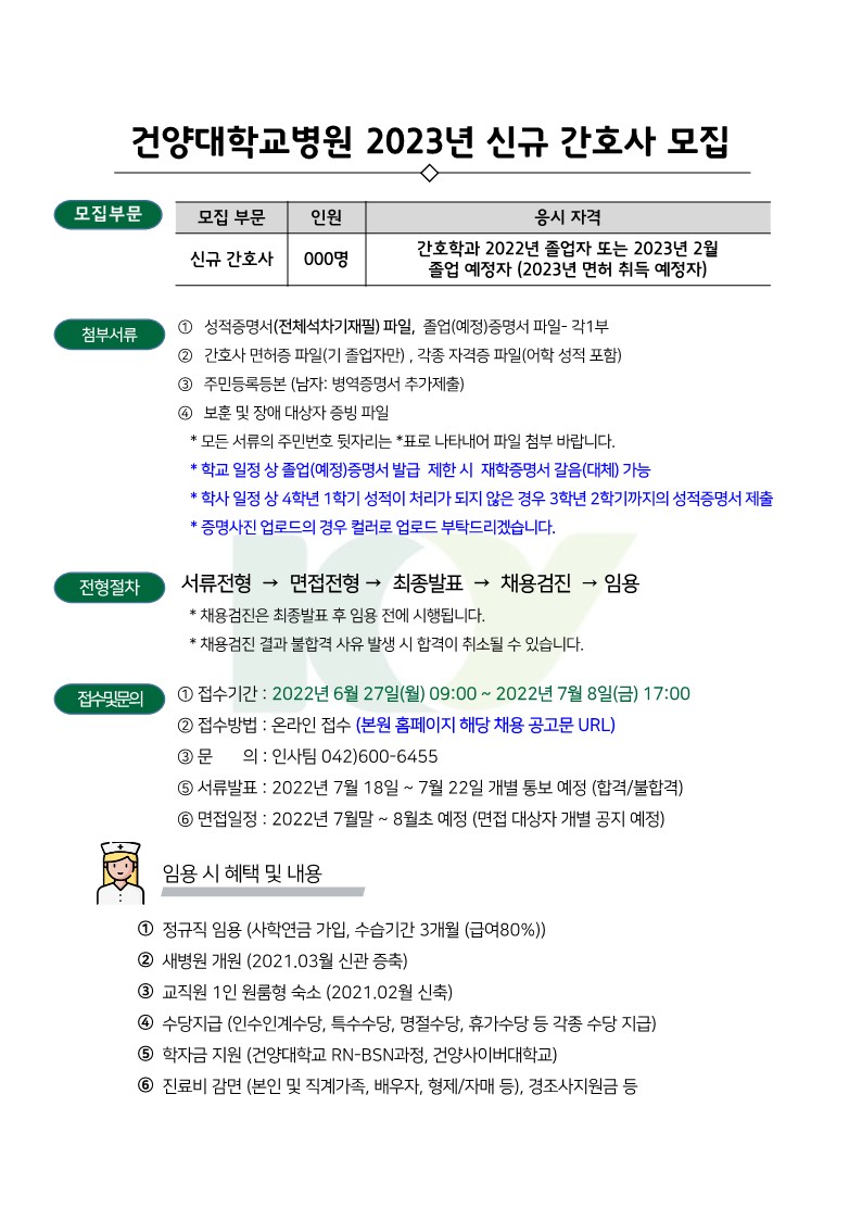 병원간호사(상급종합병원,종합병원,병원), 보건간호사, 보건진료직렬 공무원(보건소, 보건지소, 보건진료소), 보건교사, 산업간호사, 보험심사간호사, 가정전문간호사, 정신간호사, 노인전문간호사, 조산사, 방문간호사, 공공기관(한국보건산업진흥원, 한국보건사회연구원, 국민건강보험공단, 건강보험심사, 평가원 등 공공기관에서 간호사 연구원), 대학원 진학