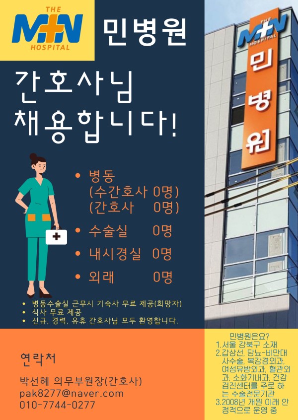-복리후생: 퇴직금, 4대보험, 식사 무료 제공(조식, 중식, 석식), 병동, 수술실 근무시 희망자 기숙사 무료 제공