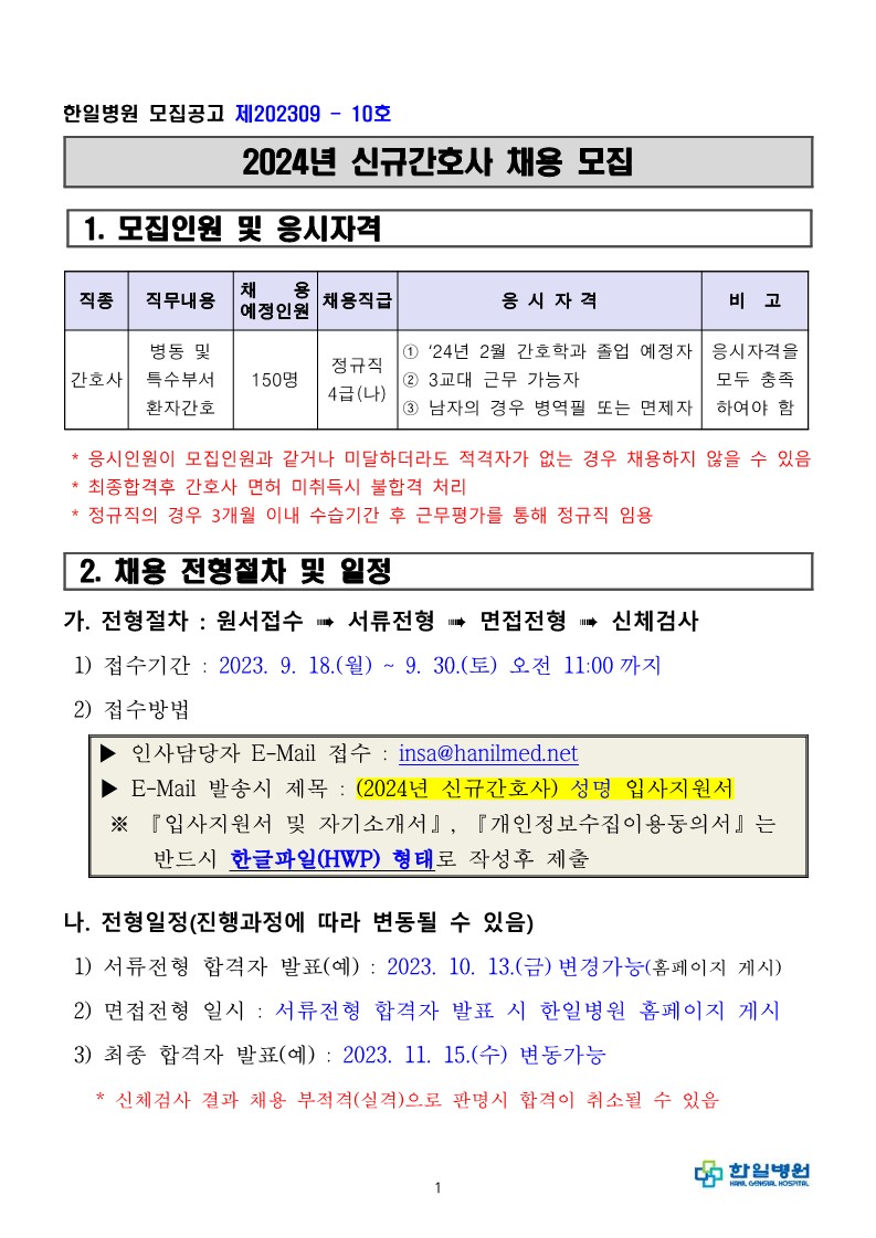 2024년 한일병원 신규간호사 채용 모집 공고