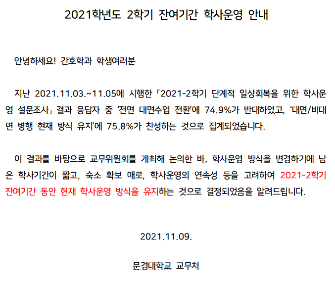 2021학년도 2학기 잔여기간 학사운영 안내