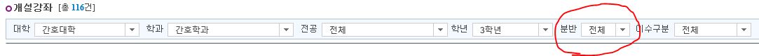 수강신청하실때 시스템 메뉴의 분반을 '전체'로 선택해야 교과목 전체 분반이 노출됩니다.